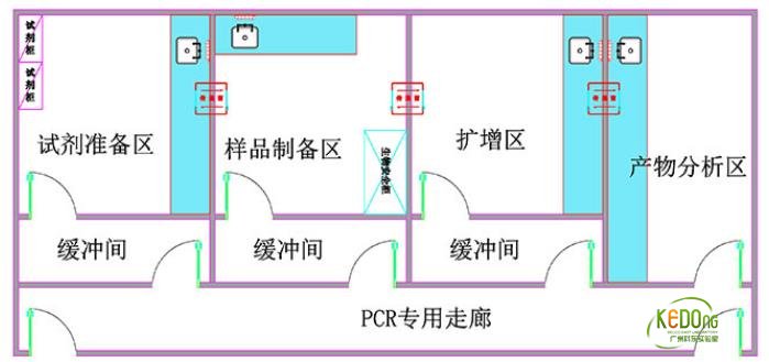 2.無論PCR實驗室分為四個、三個或兩個獨立的實驗區,每個實驗區都應有一個獨立的緩沖室,整個實驗區是一個完整的緩沖走廊。通過調整各區域的氣壓,整個PCR實驗室可以避免氣溶膠的污染。